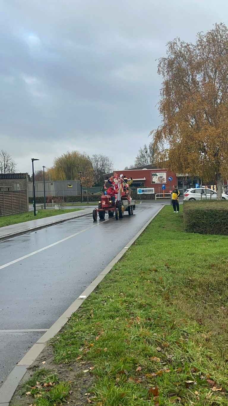 De Sint kwam er rond 14:00 aan per traktor en versierde kar. De kindjes stonden hem buiten reeds op te wachten.